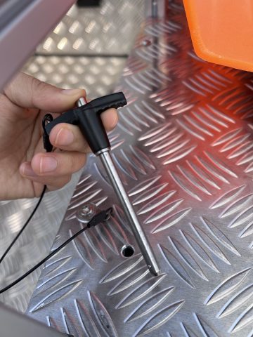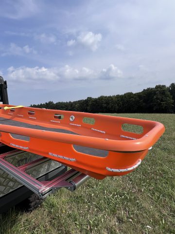 Die Sicherheit während des Fahrens wird natürlich groß geschrieben und durch ein ausziehbare Ablage erreichen wir ein dauerhaftes Aufliegen der Schleifkorbtrage. Diese kann mit Spanngurten an den dafür vorgesehenen Stangen befestigt werden. Der Sanitäter findet auf einem Sitz mit Sicherheitsgurt platz und kann den Verletzten während der Fahrt weiter betreuen.