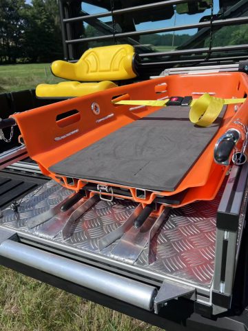 Die Sicherheit während der Fahrt hat einen hohen Stellenwert. Durch eine ausziehbare Ablage wird ein dauerhaftes und definiertes Aufliegen der Schleifkorbtrage gewährleistet. Diese kann während der Fahrt mithilfe vorderer sowie seitlicher Halterungen sicher fixiert werden.