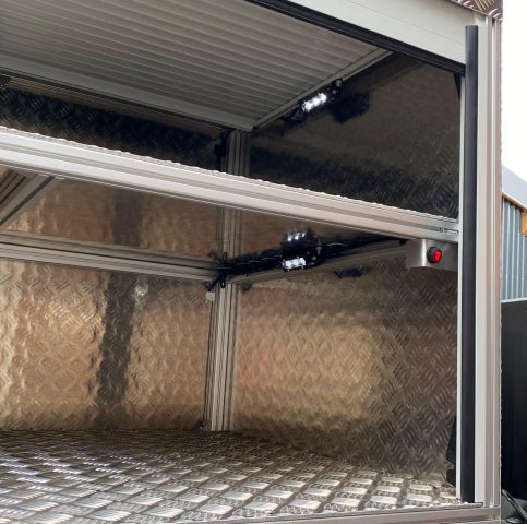 Dank der robusten Konstruktion aus Quintett-Alublech und des großen, abschließbaren Rollladens ist der Inhalt zuverlässig vor Witterung und äußeren Einflüssen geschützt. Der mittlere Boden ist modular ausgeführt und kann an die jeweiligen Anforderungen individuell angepasst werden.
